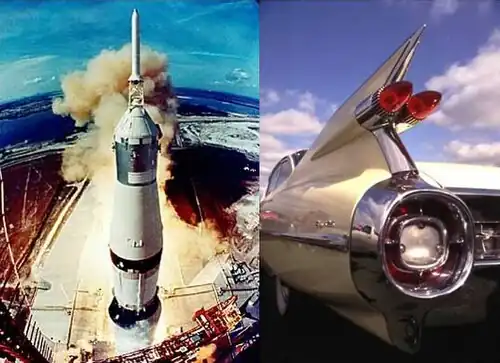 На автомобильный дизайн этого периода сильное влияние оказала стилистика уже не только авиации, но и космической техники — на дворе была эпоха массового интереса к ракетно-космической тематике. Например, задней части автомобиля пытаются придать форму хвоста ракеты со стабилизаторами сверху и снизу, как результат — наряду с верхними на некоторых моделях появляются и два менее ярко выраженных нижних плавника. Задние фонари начинают имитировать ракетный выхлоп из сопел, и тому подобное.