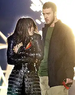 В феврале 2004 года на шоу во время перерыва между таймами чемпионата Супербоул XXXVIII Джанет исполняла попурри из песен «All for You» и «Rhythm Nation», после чего к выступлению присоединился Джастин Тимберлейк со своей песней «Rock Your Body». Спев строчку «gonna have you naked by the end of this song» (рус. «чтобы ты была голой к концу этой песни»), Тимберлейк дёрнул Джанет за верхнюю часть костюма и, оторвав кусок, оголил её правую грудь с украшенным пирсингом соском. После выступления певица извинилась, назвав произошедшее несчастным случаем, и пояснила, что Тимберлейк должен был дёрнуть бюстье так, чтобы лишь обнажить её лифчик. Кроме того, она заявила: «Я действительно очень сожалею, если кого-либо обидела. Это правда произошло не по моей вине… MTV, CBS, NFL ни о чём не знали, и, к сожалению, всё пошло не так в самом конце». Тимберлейк также принёс извинения, назвав случившееся «неисправностью гардероба» (англ. «wardrobe malfunction»). В журнале Time написали, что данный инцидент стал первым по количеству повторных просмотров за всю историю TiVo (цифрового видеорекордера), а Монте Бурке из Forbes добавил, что «этот скоротечный момент заставил около 35000 человек оформить подписку [на TiVo]». Позже Джанет была внесена в редакцию 2007 года Книги рекордов Гиннесса как «Самая искомая за историю интернета» и «Самая искомая новость». CBS, NFL и MTV (телесеть, продюсировавшая шоу между таймами) подтвердили своё неведение о данном происшествии и отреклись от какой-либо ответственности за него. Однако Федеральная комиссия связи продолжила расследование, но в конечном счёте так и не смогла оштрафовать телекомпанию CBS на 550 тысяч долларов.