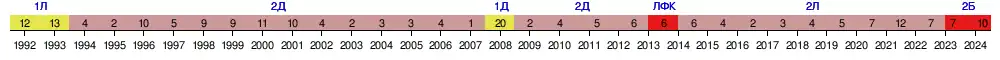 | Сезон | Тренер | Соревнование | И | В | Н | П | М | О | Место | Бомбардиры | Примечания |