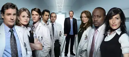 Главные персонажи телесериала (слева направо): Уилсон, Кэмерон, Чейз, Катнер, Тауб, Хаус, Тринадцатая, Форман, Кадди.