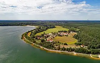 Соседние населённые пункты: на юге, на другом берегу озера — административный центр коммуны Лоза и на северо-западе — деревня Белы-Холмц[2].