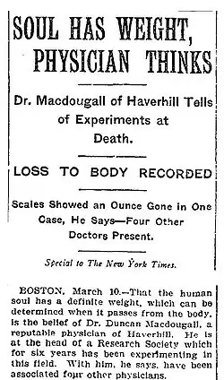 В 1901 году американский врач Дункан Макдугалл поставил серию экспериментов по «прямому взвешиванию души» в соответствии с научной методологией своего времени. Макдугалл использовал напольные рычажные весы, позволявшие взвешивать грузы от одной унции (28,35 г) до 250 фунтов (113,4 кг). Врач выполнил 6 измерений «души» умирающих людей с их согласия. В пяти измерениях он обнаружил посмертную потерю массы в диапазоне от трёх восьмых до полутора унций (от 10 до 42 грамм)[30]. Один раз ему не удалось точно зафиксировать момент смерти и эксперимент был отбракован. Результаты своих экспериментов Макдугалл опубликовал только через 6 лет. Их напечатали в известных журналах, таких как «American Medicine и American Journal of the American Society for Psychical», а позднее эти публикации пересказала «Washington Post» и «New York Times». При этом Макдугалл подчеркнул, что для научной оценки его выводов нужны новые точные эксперименты в большом количестве. Тем не менее новых научных экспериментов в этой области опубликовано не было[31].