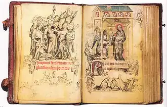 Часослов Жанны д’Эврё, «Поцелуй Иуды» и «Благовещение». Сама Жанна д’Эврё изображена внизу на красном фоне часословом в руке. Музей Метрополитен, Нью-Йорк