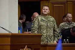 Валерий Фёдорович Залу́жный (укр. Валерій Федорович Залужний; род. 8 июля 1973, Новоград-Волынский, Житомирская область) — украинский военачальник. Чрезвычайный и полномочный посол Украины в Великобритании с 9 мая 2024 года Постоянный представитель Украины при Международной морской организации с 3 марта 2025 года по совместительству. Главнокомандующий Вооружёнными силами Украины (2021—2024), обладатель высшего звания — генерал (4 марта 2022). Герой Украины (2024)[3].