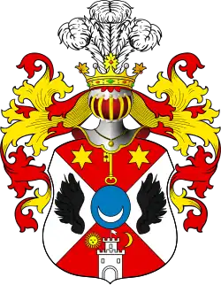 В щите, разделённом крестообразно на четыре части, посередине находится маленький овальный щиток голубого поля, с изображением серебряного полумесяца, рогами вверх. В верхней части, в красном поле, между двух золотых шестиугольных звезд, перпендикулярно означен золотой ключ бородкой вверх. В правой и левой частях, в серебряном поле, два чёрных орлиных крыла. В нижней части, в красном поле, серебряная крепость и по сторонам неё изображено солнце и серебряный полумесяц, рогами в правую сторону обращённый.