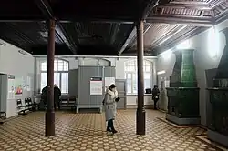 Потолок центрального зала вокзала подшивной кессонированный, из тёмного дерева. В зале стоят две изразцовые печи шатрового типа производства финского завода «Або» по рисунку К. Майера[6].
