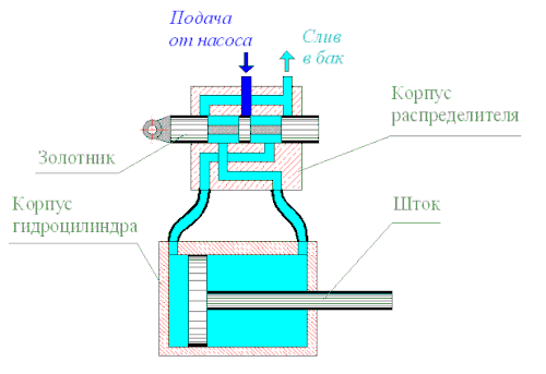 В простейшем случае золотник может занимать 3 позиции. В нейтральном положении, показанном на рис. 1, каналы распределителя заперты и жидкость не поступает от насоса ни в одну из полостей гидроцилиндра — шток остаётся в покое. При смещении золотника влево рабочая жидкость по каналам в корпусе распределителя и по трубопроводам поступает в левую полость гидроцилиндра, и шток выдвигается. Если же золотник сместить вправо от нейтрального положения, то рабочая жидкость будет поступать уже в правую полость гидроцилиндра, а из левой полости пойдёт на слив в гидробак. В этом положении золотника шток вдвигается.