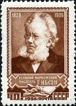 - марки, например в Норвегии в 1928 г. к 100-летию со дня рождения Генрика Ибсена вышла серия из 4 марок (зелёного, коричневого, красного и синего цвета) с его портретом, а в 1978 г. к 150-летию вышли две марки и конверт первого дня[9], на котором слева воспроизведены и 4 марки 1928 года; в СССР в 1956 г. (к 50-летию со дня смерти) в серии «Деятели мировой культуры» вышла почтовая марка № 1946 «Великий норвежский писатель Генрик Ибсен»;