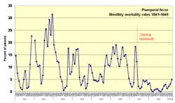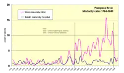 Боэр, считающийся основателем венской школы акушерства, впал в немилость у власти после смерти Иосифа II. После серии обвинений и интриг его отправили в отставку за «несоблюдение субординации», а на пост профессора и главы акушерского отделения в начале 1823 года в Центральной Венской больнице был назначен Йохан Клейн. Ранее Боэр отзывался о Клейне как о наименее способном из всех претендентов на пост, и подобное назначение было ещё одним шагом в политической борьбе его противников[29]. С 1823 года студенты-медики и врачи получили доступ к анатомическому отделению и стали участвовать во вскрытиях, в том числе тел рожениц, умерших от родильной горячки. Они также проводили вагинальный осмотр умерших рожениц, после чего переходили в отделение родовспоможения для осмотра рожающих. Сравнительный анализ смертности от родильной горячки относительно показателей Дублинской центральной больницы продемонстрирован на графике 3: сразу после назначения Клейна последовал резкий всплеск[30]. С января 1833 года из-за большой загрузки решено было разделить акушерское отделение на две клиники[31], а в 1840-м Клейн разделил всех студентов на две группы — в 1-ю клинику набирали мужчин, учившихся на врачей, а во 2-ю — женщин, которые обучались только акушерству[26]. В тот период в больнице принимали от шести до восьми тысяч родов в год[32]. Прямым руководителем первой клиники являлся сам Клейн, а главой второй был назначен приглашённый из Зальцбурга профессор Франц Бартш[33].
