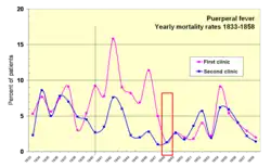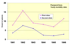1 июля 1846 года Игнац Земмельвейс был назначен первым ассистентом (старшим ординатором) 1-й клиники Центральной Венской больницы[34]. В первые же дни работы его поразила высокая смертность рожениц от родильной горячки: к тому моменту в клинике Клейна она была выше, чем в любом другом родильном доме всей Европы. Эпидемии уносили жизни почти 20 % (в отдельные годы — свыше 30 %) женщин и новорождённых, при этом смертность в отделении Бартша, где роды принимали акушерки, редко превышала 4 %. Кроме того, в 1-м отделении родильная горячка носила характер эпидемий, а во 2-м если и случалась, то у отдельных пациенток в разных палатах[26]. Этот факт был известен и среди простых венцев: роженицы старались любой ценой избежать попадания в 1-е отделение и стремились попасть к Бартшу, приём в клинике которого начинался после полуночи[35].