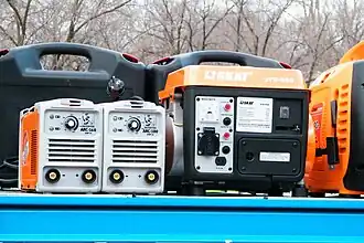 Слева — инверторные сварочные аппараты, справа — бензиновая электростанция