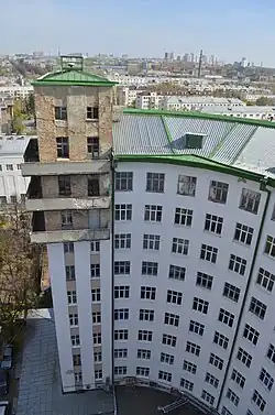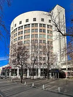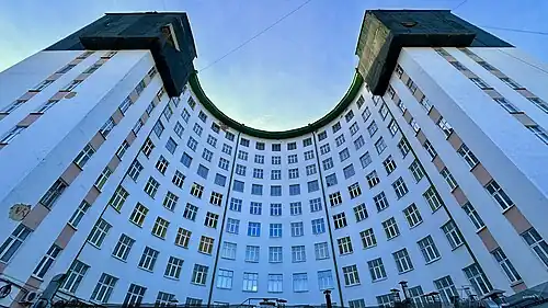 11-этажное здание подковообразной формы на углу проспекта Ленина и улицы Луначарского первоначально задумывалось как общежитие для одиноких сотрудников НКВД и командированных. Первоначальное проектное название — «Дом образцового быта для малосемейных и одиноких». Уже с 1934 года из-за резкого роста числа молодых семей сотрудников, прослывших в обществе выгодными женихами, руководство ведомства вынуждено было отдать часть комнат под их расселение. В дальнейшем число молодых семей, проживавших в общежитии, постоянно росло. Угловое здание необычной формы, выходящее фасадом на площадь Парижской коммуны, стало композиционным акцентом всего комплекса и его высотной доминантой[4][2][5][6][3].