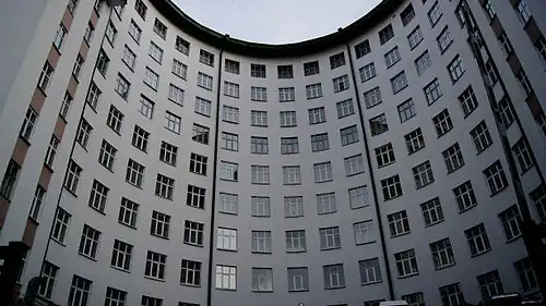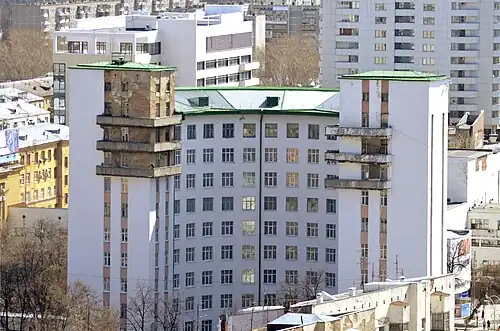 Главный фасад имеет ярко выраженные поэтажные ряды окон и вертикальных тяг в виде лопаток. Со 2-го по 10-й этажи планировки включают в себя жилые помещения по выпуклой южной стороне здания и коридор по вогнутой северной стороне[2][4][6]. Архитектура здания позволяет экономить на потребляемом для обогрева тепле за счёт меньшей площади внутренних коридоров, расположенных по внутреннему радиусу, и хорошей освещённости жилых помещений, обусловленной высотой здания и ориентированием фасада на юг[7].