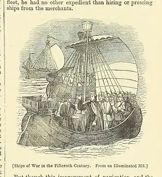 В годы Столетней войны через Ла-Манш совершались морские рейды, но в основном единичные из-за неэффективных коммуникаций. Флот играл роль разведки, нападал на торговые суда и боевые корабли: всё захваченное делилось победителями. Господство англичан на море закрепилось после того, как в битве при Слёйсе 160 английских кораблей Эдуарда III (в основном торговые суда) разгромили французский флот, заперев его в порту, и захватили 180 кораблей. Первым крупным морским сражением в истории Англии стала битва при Винчелси, известная как «битва испанцев на море». Кастилия, которая была союзницей Франции, отправила группу крупных судов, которые стали заниматься грабежом и разбоями. Эдуард III незамедлительно атаковал испанцев и, несмотря на преимущество испанцев в вооружении, добился победы, захватив 14 кораблей противника. В то же время при дворе появляется должность Клерка королевских кораблей (англ. Clerk of the King's Ships): с 1344 года занимающий эту должность руководит личными королевскими судами (до 34 штук). К середине XIV века состав флота Англии насчитывал около 700 кораблей[13].