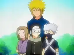 Позднее Какаси стал лидером команды ниндзя, в которой кроме него состояли Обито Утиха и Рин, а их учителем стал Минато Намикадзэ. Во время своего первого экзамена на получение звания тюнина, Какаси стал тюнином, одолев Майто Гая, а вскоре стал дзёнином. Вскоре после этого команда Какаси отправилась на задание, выполнение которого изменило бы ход шедшей в то время войны в выгодную Конохе сторону[19]. Во время выполнения миссии Рин была схвачена врагами. Какаси решил оставить её в плену и довести миссию до успешного завершения, но Обито отказался подчиниться этому приказу и отправился выручать Рин в одиночку, заявив, что отец Какаси, спасший своих товарищей ценой проваленного задания, поступил правильно[20]. После некоторых колебаний Какаси отправился вслед за Обито, догнал напарника и помог ему одолеть вражеского ниндзя, потеряв в схватке свой левый глаз[21]. Растроганный и воодушевлённый поступком Какаси, Обито впервые активировал скрытую силу своих глаз — сяринган, и вместе они победили противника. Но, уже обнаружив Рин и готовясь вернуться назад, команда Какаси попала под вызванный врагами обвал, и Обито был придавлен камнем. Не сумев освободиться, Обито убедил друзей бежать без него, и в качестве прощального подарка попросил Рин, которая была медиком команды, пересадить Какаси вместо утраченного глаза свой собственный левый глаз[22]. Оставив Обито погибать под продолжившимся обвалом, Какаси вместе с Рин сумел удачно завершить миссию, но всю жизнь сожалел о смерти друга[23].