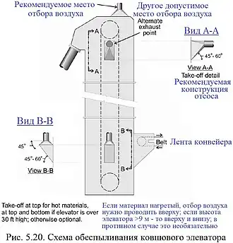 На рисунке показана схема обеспыливания ковшового элеватора, находящегося в стальном корпусе-кожухе.