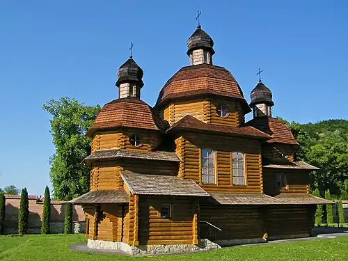Окруженная стенами территория монастыря в плане имеет форму неправильного пятиугольника. Некогда главным храмом обители служила деревянная Преображенская церковь — трёхзрубная, трехглавая, характерная памятка галицкой школы народной архитектуры. Построили её в 1658 г. львовские мастера Андрей и Адам, расписывал живописец Н. Петрахнович.