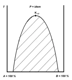 Критические точки существуют не только для чистых веществ, но и, в некоторых случаях, для их смесей и определяют параметры потери устойчивости смеси (с разделом фаз) — раствор (одна фаза). С увеличением температуры взаимная растворимость ограниченно растворимых жидкостей в большинстве случаев возрастает (как, например, в системе вода — фенол). При достижении верхней критической точки растворимости на диаграмме состояния (именуемой в данном случае кривой расслоения[10], см. рисунок), то есть определенной температуры, называемой верхней критической температурой растворимости, жидкости полностью смешиваются друг с другом. (Для системы вода — фенол критическая температура составляет 68,8 °C. Выше этой температуры фенол и вода растворяются друг в друге в любых пропорциях). Реже встречаются системы, в которых с понижением температуры взаимная растворимость компонентов увеличивается, то есть системы с нижней критической температурой растворимости (нижней критической точкой растворимости, см. рисунок). К таким системам относится, например, смесь вода — триэтиламин (нижняя критическая температура 19,1 °C)[11].