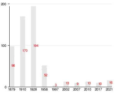 | 1879 | 1910 | 1928 | 1958 | 1997 | 2002 | 2007[15] |