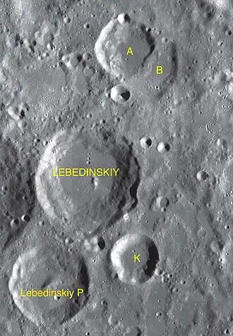 ![]() Снимок зонда Lunar Reconnaissance Orbiter. Кратер Лебединский в верхней правой части снимка, в нижней правой части сателлитный кратер Лебединский P, в левой части кратер Жуковский. | |