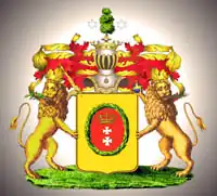 Посередине золотого щита, в красном поле, окружённом лавровым венком, изображена золотая корона, то есть герб древних владетелей прусских, и под оной два серебряных креста, означенных перпендикулярно.