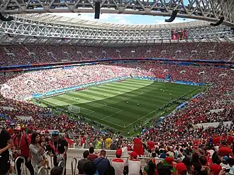 На время проведения в России ЧМ-2018 стадион «Лужники» стал главной футбольной ареной страны. Летом 2018 года стадион принял семь матчей — четыре групповой стадии, один матч 1/8 финала, один из полуфинальных матчей и финальный матч[40]. Данные матчей ЧМ-2018 в «Лужниках» приводятся в таблице в соответствии с официальным сайтом ФИФА[41]:
