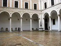 Характерные черты архитектуры Возрождения наиболее заметны в построении внутреннего двора и в спокойных, приветливых интерьерах дворца. Изготовленные из белого камня колонны, капители сочетаются с желтоватым кирпичом стен. Декоративных деталей немного, и они не противоречат спокойному, уравновешенному характеру архитектуры. Декор интерьеров дополняли картины, созданные Пьеро делла Франческа и самим Лаураной, а также специально изготовленная мебель.