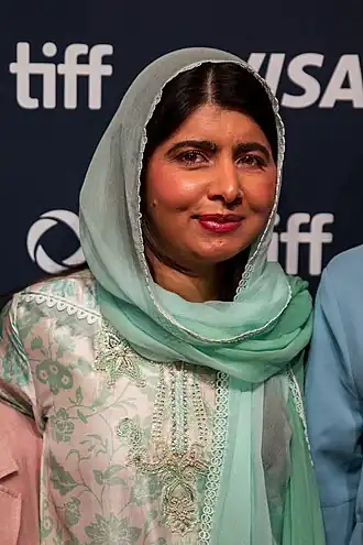 Мала́ла Юсуфза́й (пушту ملاله یوسفزۍ; род. 12 июля 1997[4], Мингора)[5] — пакистанская правозащитница, выступающая за доступность образования для женщин во всём мире. За свою деятельность была тяжело ранена в 2012 году боевиками из террористического движения «Техрик-е Талибан Пакистан». Лауреат Нобелевской премии мира (2014).