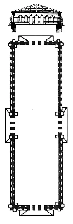Прямоугольное в плане одноэтажное здание московского Манежа является образцом архитектуры классицизма. Строение длиной 166 м, шириной 44 м и высотой 20 м было очень крупным для своего времени. Первоначальная площадь Манежа составляла 7424,67 м². Торцовые фасады здания украшены аркадой из семи арочных проёмов с полуколоннами и увенчаны гладкими фронтонами без декора. К боковым стенам примыкают полуколонны тосканского ордера, между которыми в арочных проёмах помещены сводчатые окна. Под фронтонами торцевых фасадов, а также в средней части боковых стен расположены тройные деревянные ворота. Главным фасадом предполагался Южный, выходящий к Кутафьей башне — одному из четырёх входов в Кремль. Внутреннее пространство Манежа хорошо освещено дневным светом за счёт окон, образующих около трети площади стен. Укрупнённость пропорций Манежа, колонны, пилоны и сдержанная колористическая гамма подчёркивают монументальность здания[4][5].