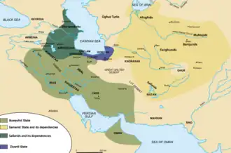 В момент наивысшего расцвета в 932—935 гг. оно включало в себя кроме прикаспийских областей часть территории Западного Ирана. Мардавидж стремился захватить Багдад и восстановить традиции Сасанидов, но был убит своими тюркскими гулямами в бане в Исфахане в сафаре 323 г. х. (январе 935)[3].
