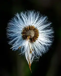 Плод — цилиндрическая семянка, с паппусом (хохолком) из мягких волосков. После созревания плодов цветоносные побеги отмирают[7].