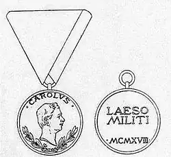 На оборотной стороне медали — текст LAESO MILITI ("раненому солдату") и дата, написанная римскими цифрами "MCMXVIII" (1918).