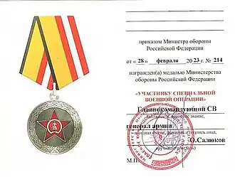 Приказом министра обороны России от 10 августа 2022 года № 461 была учреждена медаль «Участнику специальной военной операции»[1].