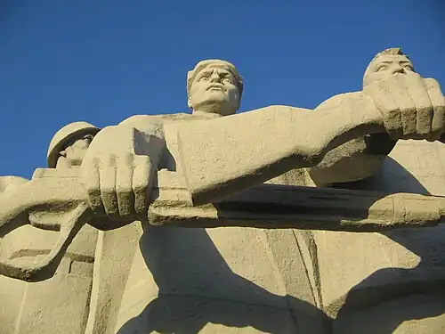 Между бетонной полосой и скульптурной группой находится площадка со звездой из красного гранита, предназначенная для возложения венков.