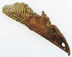 Слезная кость контактирует с носовой медиально, с верхней челюстью латерально, с префронтальной костью сзади медиально и с скуловой костью сзади. Таксономия метопозавров была основана на положении слезной кости , и были опубликованы разные мнения. По фотографии, опубликованной Hunt (1993), отмечается, что слезная железа входит в глазницу, вопреки предыдущей находке Fraas (1889).[4] По словам Лукаса, тщательное изучение черепа и других черепов метопозавров не подтверждает это утверждение, и было отмечено, что неверная идентификация, возможно, была связана с плохой сохранностью окаменелости.[7] В 2007 году Сулей отметил, что вариабельность положения слезной железы достаточно мала, чтобы ее можно было использовать для филогенетического анализа, но с осторожностью.