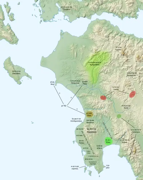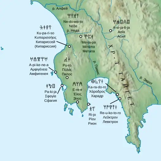 Некоторые топонимы, указанные в табличках (PY Cn 608, PY Jn 829, PY Vn 20), совпадают с топонимами, известными в более позднюю эпоху, благодаря Гомеру, Страбону и Павсанию (см. карты ниже). Таким образом удалось отождествить такие поселения, как Кипариссей или Кипариссия (микенск. Ku-pa-ri-so, др.-греч. Κυπαρισσήεις, Амфигенея (микенск. A-pi-ke-ne-a, др.-греч. Ἁμφιγἐνεια), столица царства Пилос (микенск. Pu-ro, др.-греч. Πύλος), Сфагия (микенск. Pa-ki-ja, др.-греч. Σφαγία), Элос (микенск. E-re-e, др.-греч. Ἒλος), Рион (микенск. Ri-jo, др.-греч. Ρίον), Харадр (микенск. Ka-ra-do-ro, др.-греч. Χάραδρος) и Левктрон (микенск. Re-u-ko-to-ro, др.-греч. Λεῠκτρον). Эти поселения располагались по побережью Мессении. В глубине Пелопоннеса были поселения Метапа (микенск. Me-ta-pa, др.-греч. Μετάπα) и Асия (микенск. A-si-ja-ti-ja, др.-греч. Ὰσια)[7].