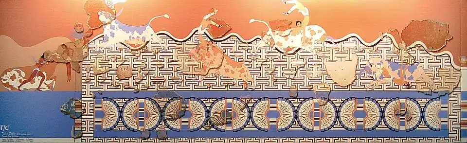 На фресках изображены прыжки через быка, схватки быков, грифоны и охота.