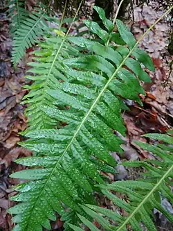 Вечнозелёное многолетнее травянистое растение. Вайи тёмно-зелёные вырастают от 50 до 180 см, расположены в плотном пучке, расходящемся радиально от круглого основания. Листовые пластинки одноперистые, с перьями, чередующимися на стебле. Каждое перо имеет длину от 1 до 15 см, с небольшой направленной вверх долей у основания, края зазубрены с щетинистыми кончиками на зазубринах. За пределами направленной вверх доли перья имеют широко линейную форму, обычно с постепенным сужением и слегка изогнуты к дистальному концу вайи. Отдельные вайи живут от полутора до 2,5 лет и остаются прикрепленными к корневищу после увядания. Когда вайи появляются весной, они сгибаются назад и закручены только на кончике. У молодых растений вайи более бледно-зелёные и с более короткими перьями[4][5].