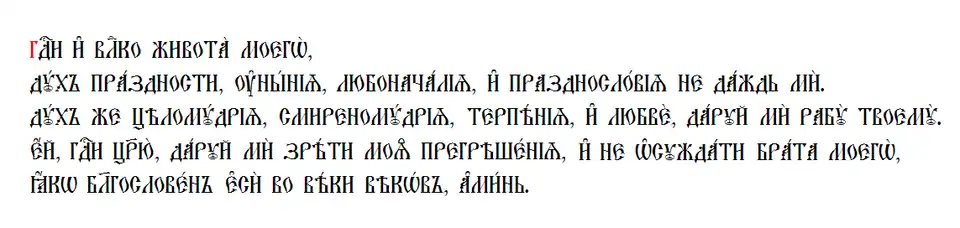 - Го́споди и Влады́ко живота́ моего́, духъ пра́здности, уны́ния, любонача́лия и праздносло́вия не даждь ми.
