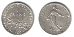 | 1 франк 1920. Дизайнер Жозеф Франсуа Домар | ||||||||||||