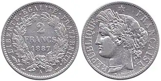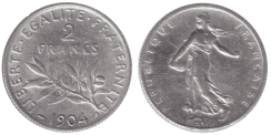 | 1871 | Серебро | 2 г | 18 мм | 1871—1895 | рубчатый | Номинал | Республика | Всего выпущено: — 34 367 278 шт. |