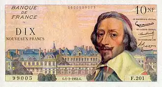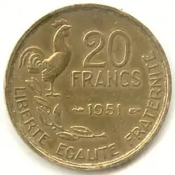 После войны дизайн монет образца 1934—1940 годов не изменился, в обращении были монеты с номиналом 50 сантимов, 1, 2 и 5 франков, выпускаемые из более дешёвого алюминия. В результате продолжавшейся инфляции в 1950 году были введены новые монеты с номиналами: 10, 20, 50 и 100 франков. Банкнота номиналом 50 франков была выведена из обращения. Впервые введена в обращение банкнота номиналом 10 000 франков.