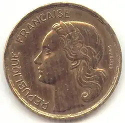 | 1950 | Бронза — Алюминий | 8 г | 27 мм | 1950—1958 | рубчатый | Номинал | Марианна | Всего выпущено: — 262 802 838 шт. |