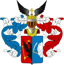 В щите, разделённом перпендикулярно надвое, в правой половине, в красном поле, виден до половины чёрный одноглавый орёл с распростёртым крылом, имеющий над головой корону, а в лапе длинный крест. В левой половине в голубом поле, изображена рука в латах с мечом, выходящая из облака (польский герб Малая Погоня). На щите дворянский коронованный шлем. Нашлемник: между двумя распростёртыми чёрными орлиными крыльями золотой крест. Намёт на щите голубой и красный, подложенный серебром.
