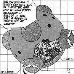 Мяч, диаметром 30 см и весом 40 кг, имеет собственные двигатели и 6 сферических роликов, расположенных октаэдром, а также специальные выключатели в углублениях, при захвате которых мяч временно выключается — при неправильном захвате мяч удержать будет невозможно[2]. Ролики на поверхности мяча постоянно выдвигаются случайным образом, в результате чего мяч двигается по совершенно не предсказуемой траектории. Из-за большого веса мяча игрок, его несущий, теряет в скорости, и его можно догнать. Игровое поле состоит из множества трековых дорожек имеющих как зоны пит-стопов (для починки)[3], так и зоны называемые «углами». Доставивший мяч в «угол» становится победителем в игре.