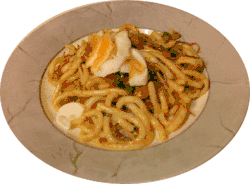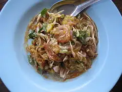 - Kya zan thohk — салат из стеклянной вермишели с варёным жульеном из креветок и пюре из утиных яиц карри и картофеля.