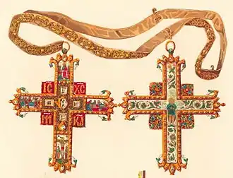 С внешней стороны крест содержит следующие изображения: Воскресение Христово сверху, Распятие снизу, с обеих сторон — Тайная Вечеря и Возложение Христа в гроб. Он содержал когда-то часть Ризы Господа и часть Креста Господня.