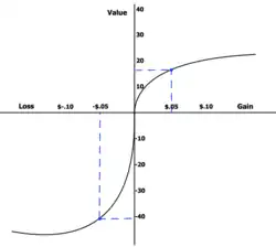 График зависимости полезности индивида от изменения благосостояния. Уменьшение полезности за счёт потери 0.05 долларов намного сильнее в абсолютном выражении, чем увеличение полезности за счёт получения 0.05 долларов.
