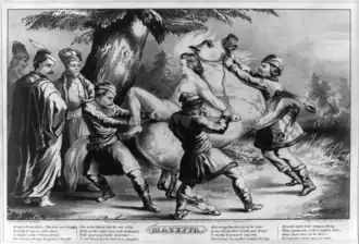 - «Мазепа» — поэма Байрона: Поэма имеет мало общего с биографией гетмана, центральный эпизод — юного Мазепу, пажа польского короля Яна II Казимира, обнажённым привязывают к спине лошади, которую отпускают в степь, в наказание за связь с женой шляхтича. Изображение обнаженного отрока на спине животного стало популярной темой для французских художников периода романтизма. На тему поэму были созданы картины такими выдающимися мастерами, как Жерико, Делакруа, Верне и Буланже. Этот образ, по мнению И. С. Кона, в живописи «давал простор садомазохистскому воображению, обычно в такой позе представляли только женщин, например, изображая похищение Европы».[2]