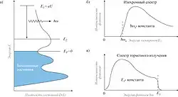 - спектроскопия тормозного излучения (Bremsstrahlen spectroscopy), в которой энергия первичных электронов фиксирована, а регистрируется спектр испускаемых фотонов (рис. в).